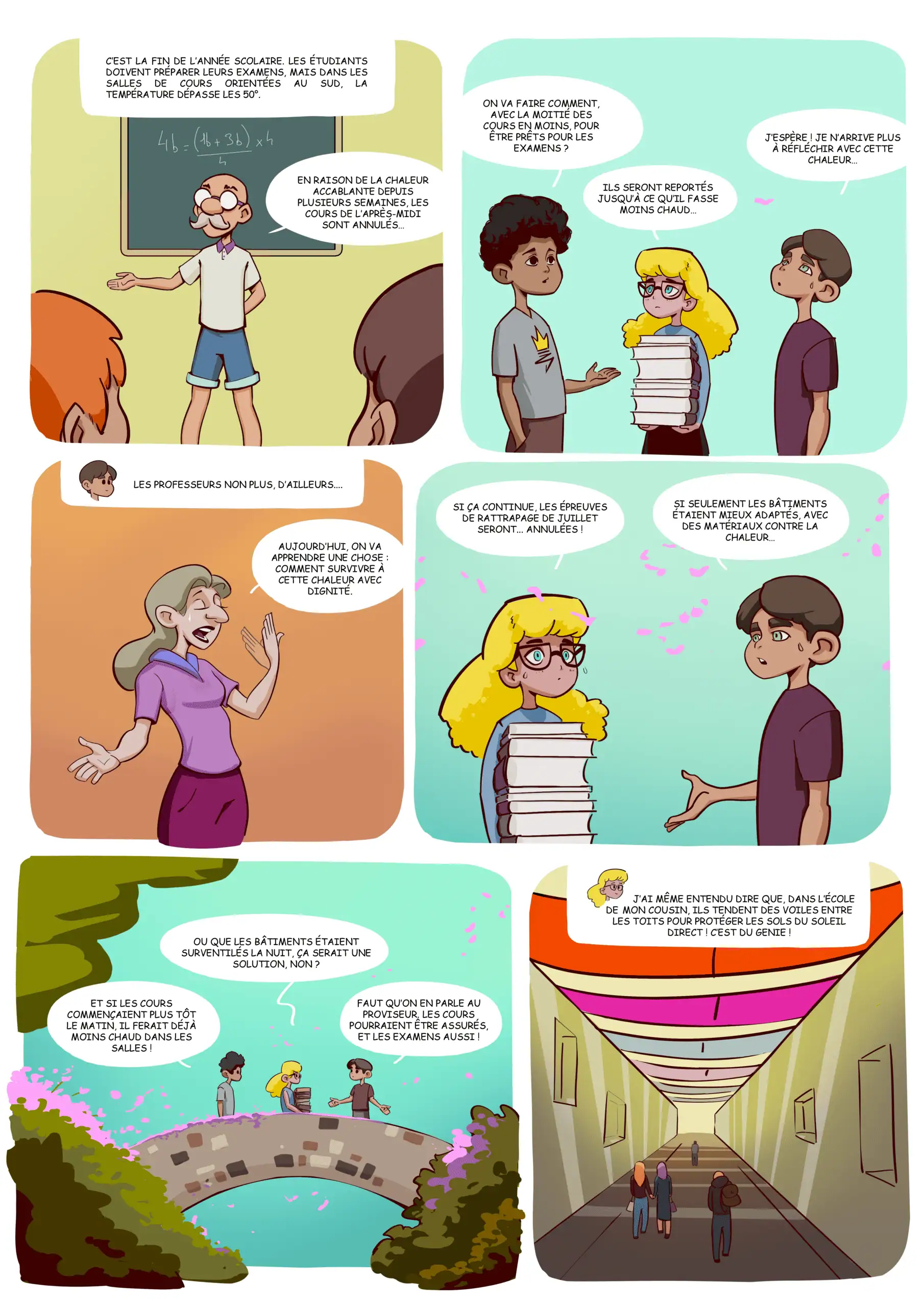 Les examens, tombant pendant la vague de chaleur, sont décalés en urgence à une date inconnue, les capacités de raisonnement des étudiants et des enseignants se détériorant trop du fait de l’intense chaleur dans les salles – en fait, reportés à après la vague de chaleur, date qui n’est connue qu’une fois qu’elle se termine.